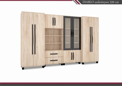 Diablo szekrénysorunk 320 centiméteres kivitelben kapható. Hagyományos formavilágát az ívelt fogója és fekete keretes vitrines eleme teszi még elegánsabbá. Sonoma tölgy, san remo színekben kapható. Jól kihasználható belső terei vannak.