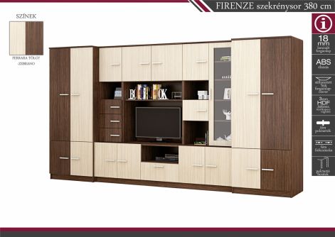 A klasszikus Firenze szekrénysor időtálló megjelenésével számos nappali éke lehet. Két méretben érhető el, 340 és 380 cm-es kivitelben.
